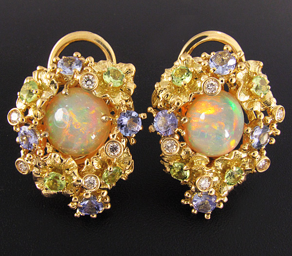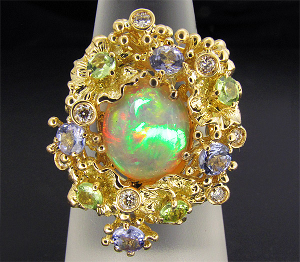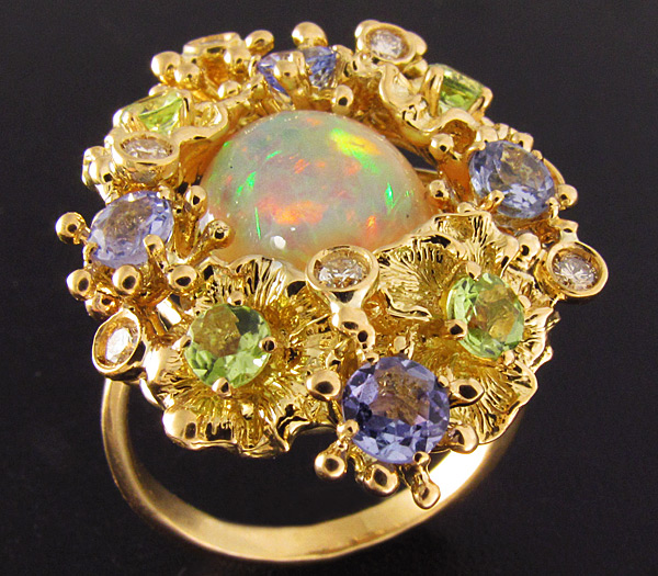 Комплект (кольцо + серьги) с эфиопскими опалами, бриллиантами, танзанитами и перидотами