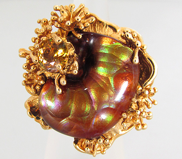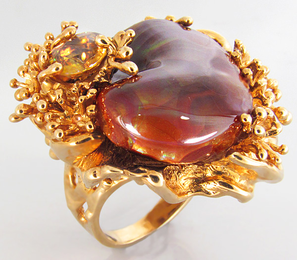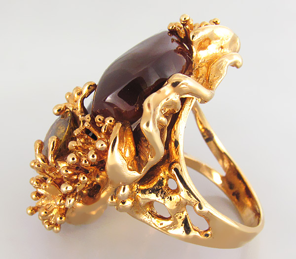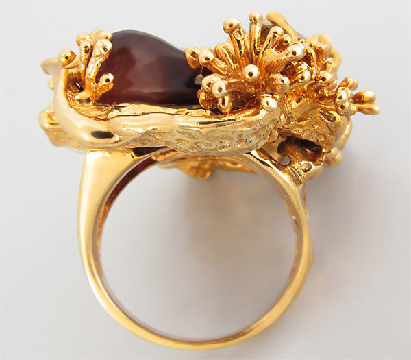 Вашему вниманию предлагается кольцо из золота 585 пробы с мексиканским огненным агатом и великолепным золотистым сфеном! Уникальный эскиз кольца выполнен дизайнером компании «Серебряные линии». Площадка кольца 32 х 30 мм, высота 13 мм. Вес изделия 21,7 г. Размер 16,5. Ниже приводятся ювелирные характеристики вставок.