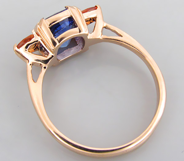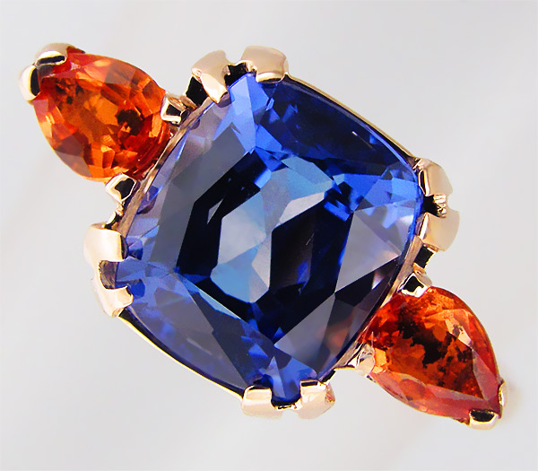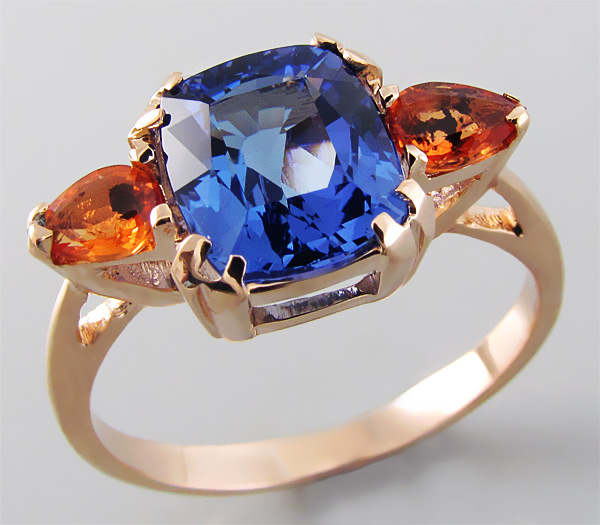 Вашему вниманию предлагается кольцо из золота 585 пробы с танзанитом и оранжевыми сапфирами! Размеры сапфиров 3 х 4 мм. Площадка кольца 8 х 11 мм, высота 6 мм. Вес изделия 3,1 г. Размер 17. Ниже приводятся ювелирные характеристики танзанита.