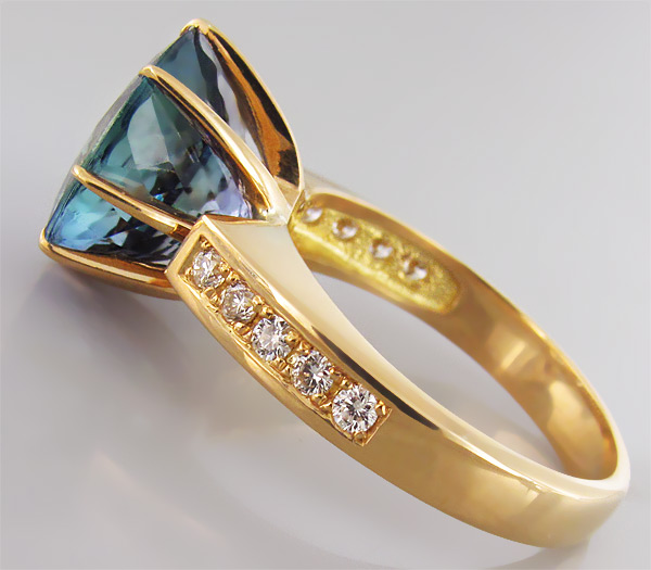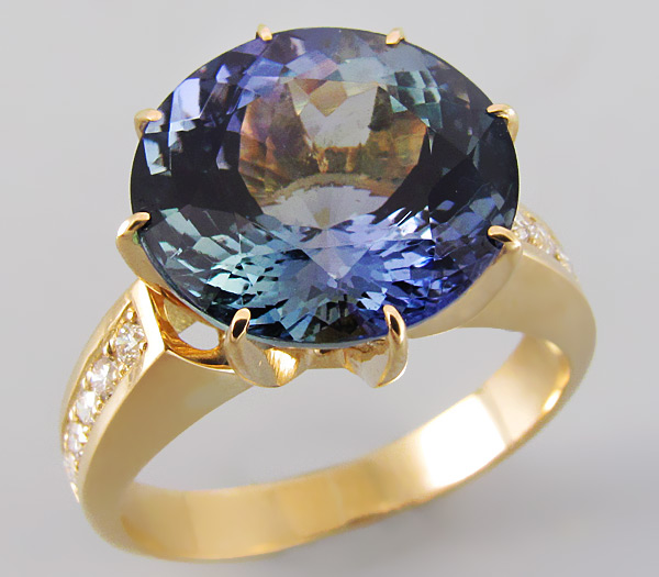 Вашему вниманию предлагается кольцо из золота 750 пробы с полихромным танзанитом и 10-ю бриллиантами! Диаметр бриллиантов 1,5 мм, общий вес 0,13 карата. Ширина площадки 12 мм, высота 8 мм. Вес изделия 4,9 г. Размер 16,5. Ниже приводятся ювелирные характеристики танзанита.