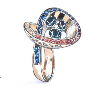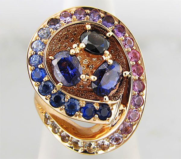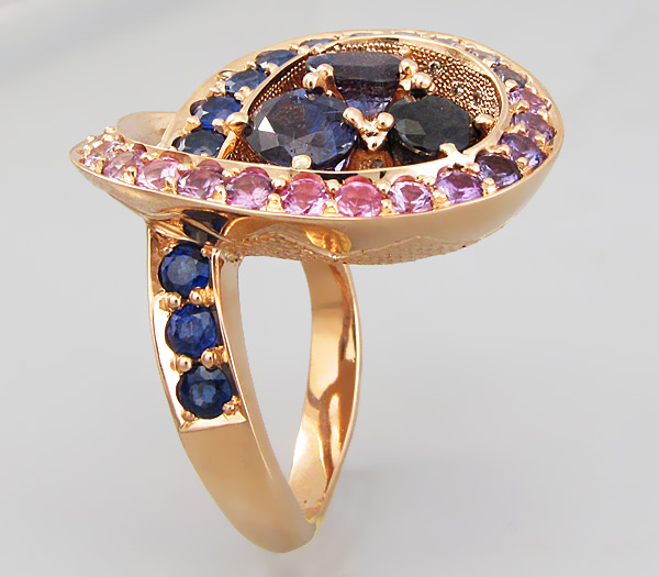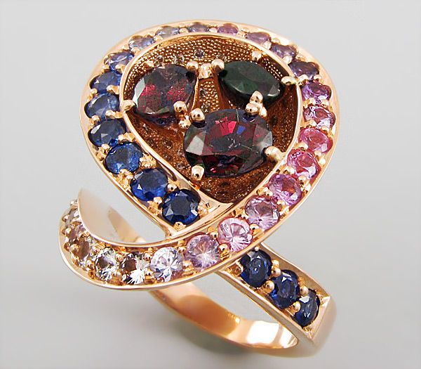 Кольцо с гранатами с александритовым эффектом, разноцветными сапфирами и бриллиантами