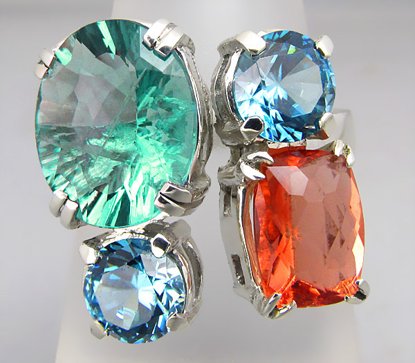 Вашему вниманию предлагается кольцо из стерлингового серебра 925 пробы с флюоритами и цирконами! Размеры площадки 19 х 18,5 мм, высота 7 мм. Вес изделия 9,4 г. Размер 18,5. Ниже приводятся ювелирные характеристики вставок.