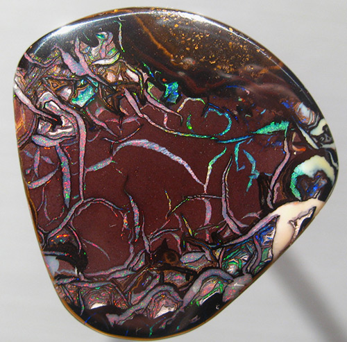 Вашему вниманию предлагается кольцо из золота 585 пробы с болдер опалом и 88-ю бриллиантами! Диаметр бриллиантов 1 мм, общий вес 0,38 карата. Размеры площадки 34 х 35,5 мм, высота 12 мм. Вес изделия 22 г. Размер 17. Ниже приводятся ювелирные характеристики опала.