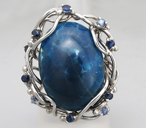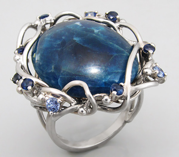 Кольцо с крупным кабошоном апатита и сапфирами