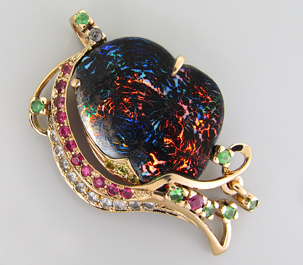 Кулон с фантастическим болдер опалом, цаворитами гранатами и разноцветными сапфирами