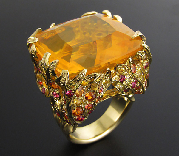 Кольцо с мексиканским огненным опалом и разноцветными сапфирами