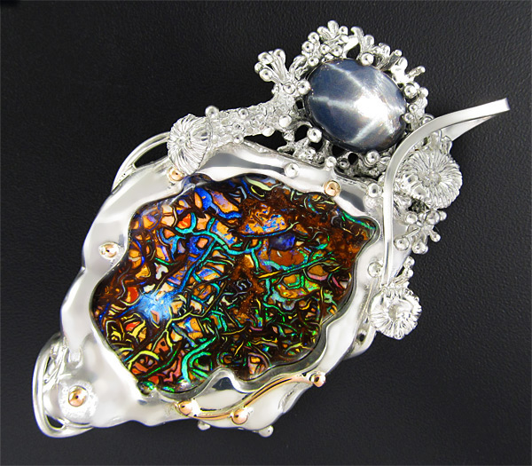 Вашему вниманию предлагается кулон из стерлингового серебра (925 проба) с болдер опалом и звездчатым сапфиром! Основные цвета опалесценции опала: зеленый/фиолетовый/синий. Розовые декоративные элементы выполнены из золота 585 пробы. Площадка кулона 64 х 35 мм. Вес 33,4 г. К кулону прилагается кожаный шнур с застежкой из стерлингового серебра длиной 480 мм. Ниже приводятся ювелирные характеристики опала и сапфира.