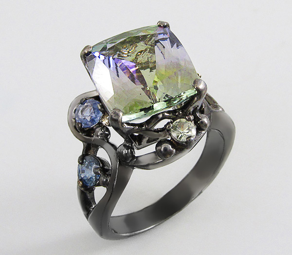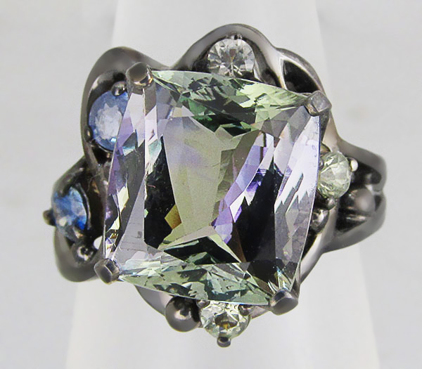 Кольцо с полихромным танзанитом, светло-зелеными и синими сапфирами