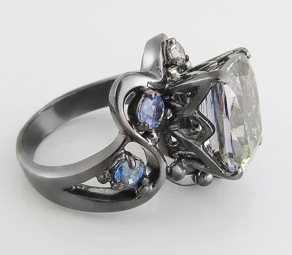 Вашему вниманию предлагается кольцо из черненного стерлингового серебра 925 пробы с полихромным танзанитом, светло-зелеными и синими сапфирами! Диаметр сапфиров 2 мм и 3 мм. Площадка 19 х 17 мм, высота 10 мм. Вес изделия 7,2 г. Размер 17. Ниже приводятся ювелирные характеристики танзанита.