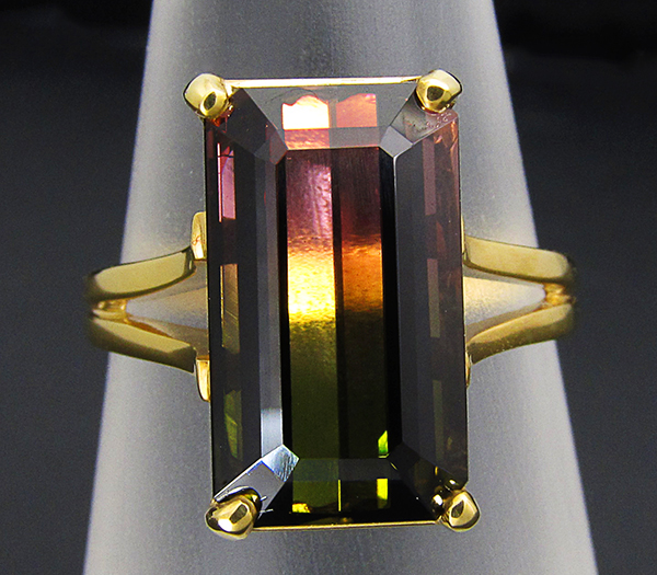 Вашему вниманию предлагается кольцо из золота 750 пробы с арбузным турмалином! Площадка 14 х 9 мм, высота 7 мм. Вес изделия 4,6 г. Размер 17. Ниже приводятся ювелирные характеристики турмалина.