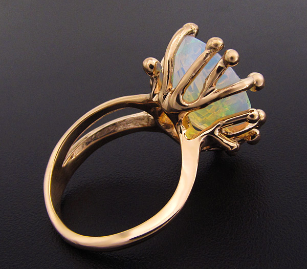 Вашему вниманию предлагается кольцо из золота 585 пробы с крупным ограненным эфиопским опалом! Площадка 19 х 15 мм, высота 9 мм. Вес изделия 5,9 г. Размер 15,5. Ниже приводятся ювелирные характеристики опала.