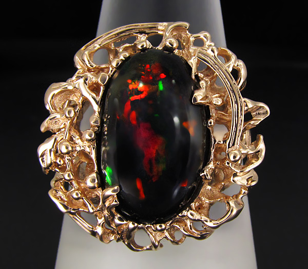 Вашему вниманию предлагается кольцо из золота 585 пробы с черным опалом! Сквозная опалесценция камня! Площадка 23 х 23 мм, высота 7 мм. Вес изделия 7,9 г. Размер 20. Ниже приводятся ювелирные характеристики опала.