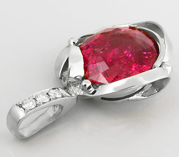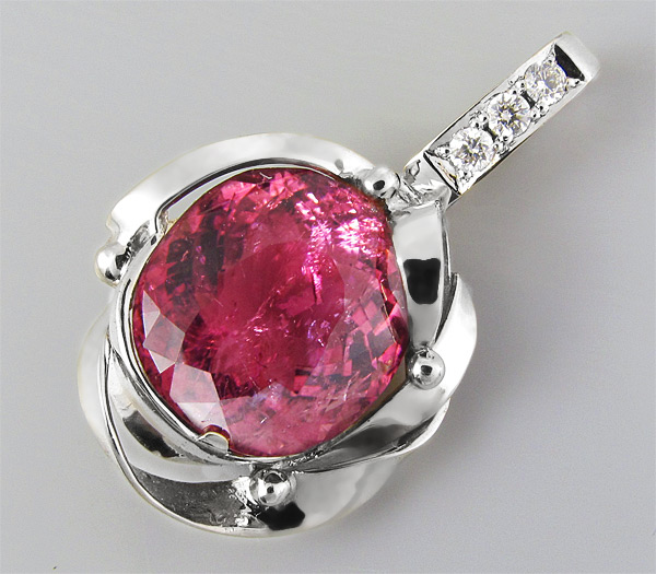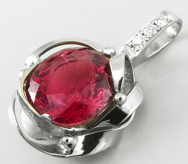 Вашему вниманию предлагается кулон из золота 585 робы с красивейшим рубеллитом и бриллиантами массой 0,09 карат! Диаметр бриллиантов 2 мм. Размеры кулона с петлей 30 х 8 мм. Вес 5,2 г. Ниже приводятся ювелирные характеристики рубеллита.