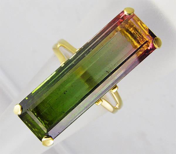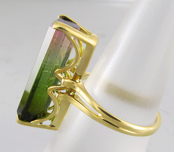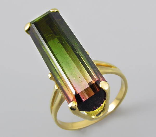 Вашему вниманию предлагается кольцо из золота 750 пробы с арбузным турмалином! Площадка 23 х 8 мм, высота 10 мм. Вес изделия 6,4 г. Размер 16,25 Ниже приводятся ювелирные харктеристики турмалина.