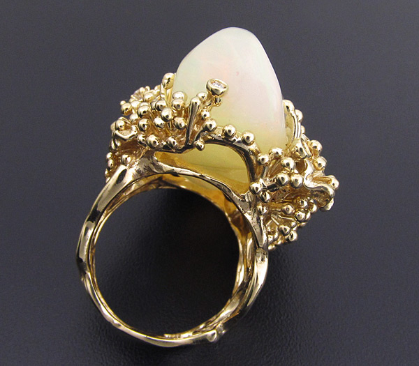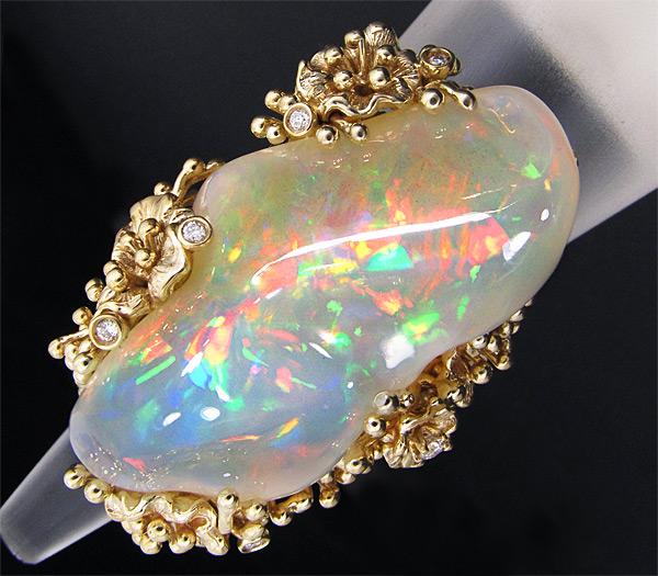 Вашему вниманию предлагается кольцо из золота 585 пробы с эфиопским опалом и бриллиантами (массой 0,1 карат)! Основные цвета опалесценции опала: зеленый/желтый/оранжевый/красный. Диаметр бриллианта 1,5 мм. Площадка 37 х 24 мм, высота 16 мм. Вес изделия 24 г. Размер 17. Ниже приводятся ювелирные характеристики опала.