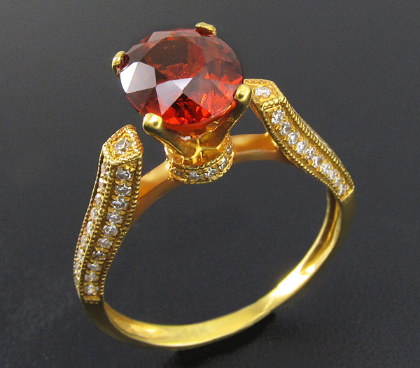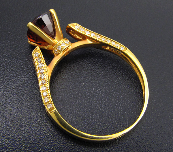 Вашему вниманию предлагается кольцо из золота 750 пробы со спессартином гранатом и бриллиантами (массой 0,3 карат)! Диаметр бриллиантов 1 мм. Площадка 18 х 8 мм, высота 9 мм. Вес изделия 2,3 г. Размер 16,25. Ниже приводятся ювелирные характеристики спессартина.