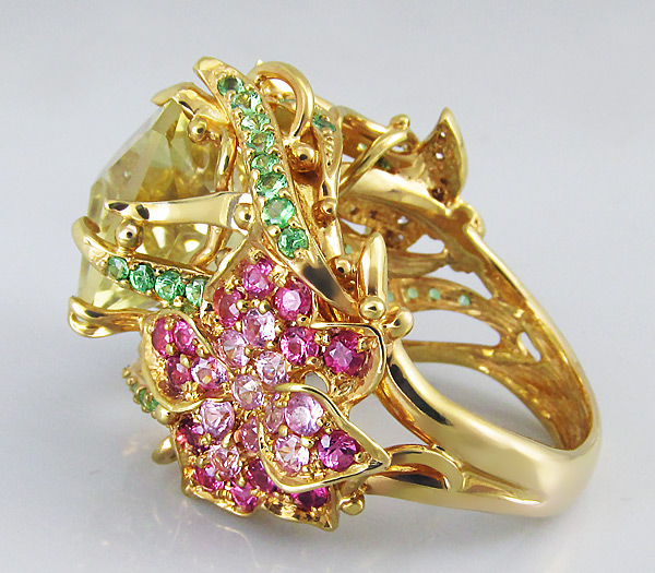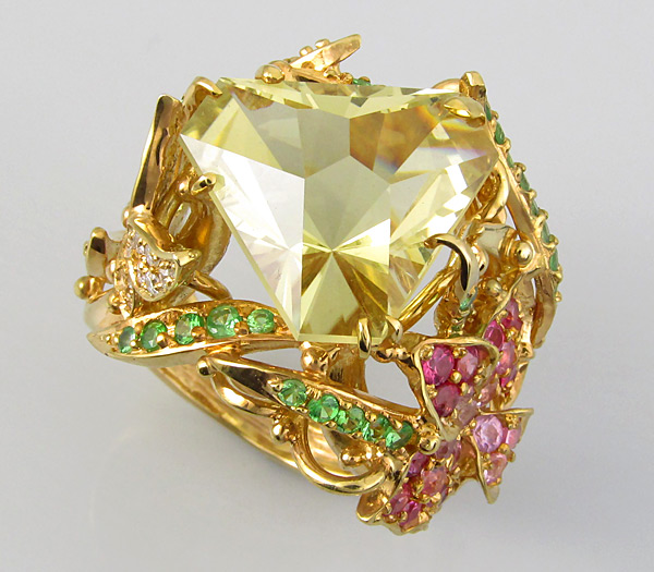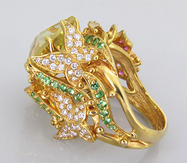 Кольцо с лимонным цитрином авторской огранки и самоцветами