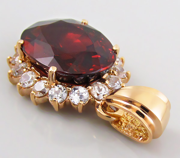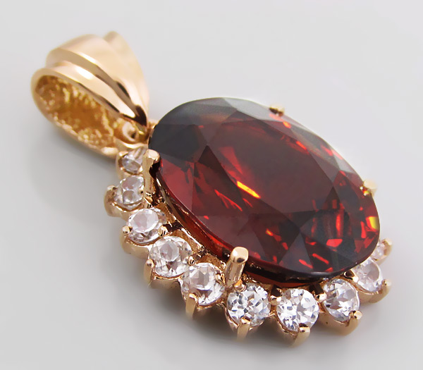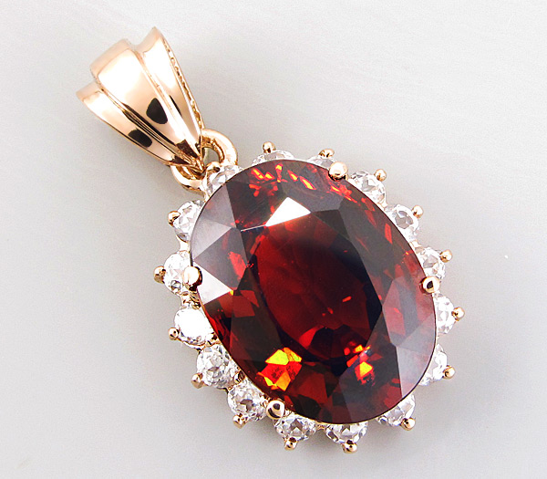 Вашему вниманию предлагается кулон из золота 585 пробы с крупным спессартином гранатом и лейкосапфирами! Диаметр сапфиров 2,5 мм. Размеры кулона с петлей 28 х 16 мм. Вес 5,1 г. Ниже приводятся ювелирные характеристики спессартина.