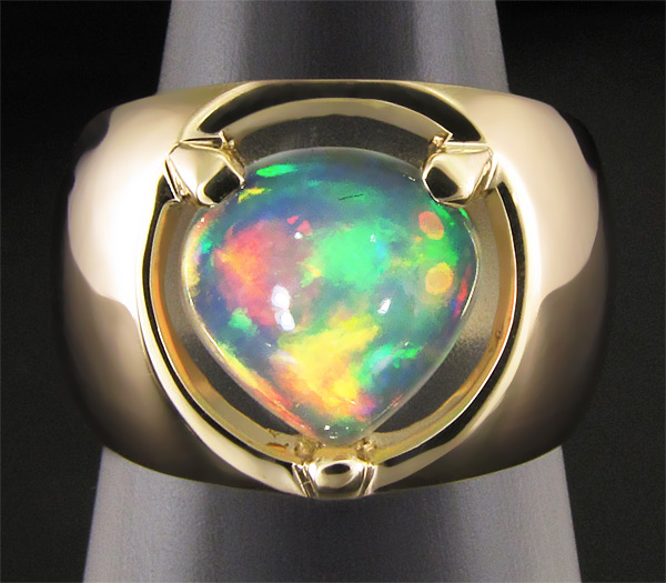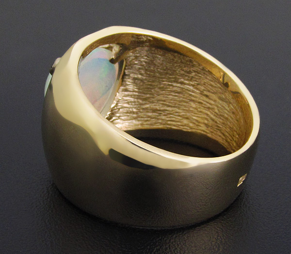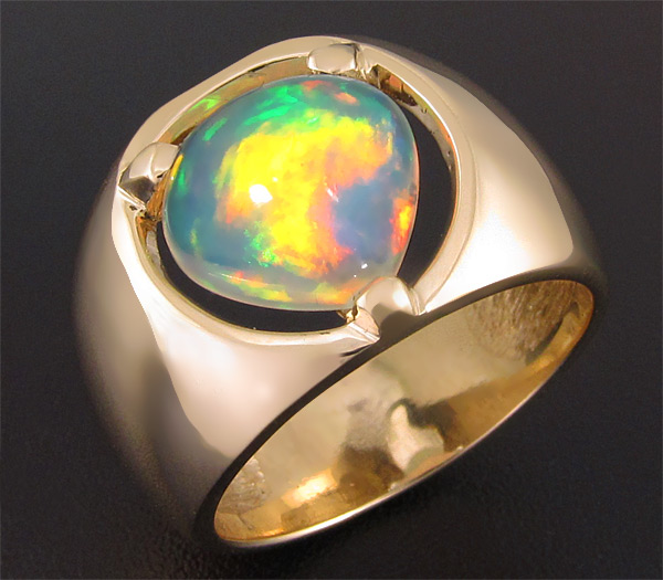 Вашему вниманию предлагается кольцо из золота 585 пробы с эфиопским опалом! Основные цвета опалесценции опала: красный/желтый/зеленый/оранжевый. Ширина площадки 14 мм, высота 5 мм. Вес изделия 9,4 г. Размер 17,5.