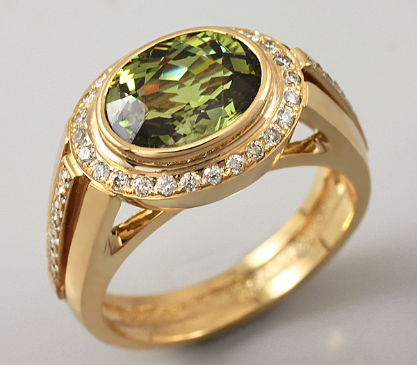 Вашему вниманию предлагается кольцо из золота 750 пробы с демантоидом гранатом высокой чистоты и 42 бриллиантами массой 0,18 карат! Площадка 20 х 10 мм, высота 8 мм. Вес изделия 7,2 г. Размер 16,5. Ниже приводятся ювелирные характеристики дмантоида.