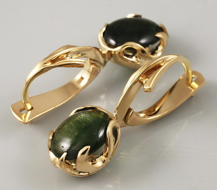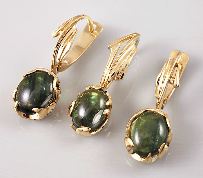 Вашему вниманию предлагается комплект (серьги + кулон) из золота 585 пробы с кабошонами зеленых сапфиров! Вес комплекта 7,7 г.