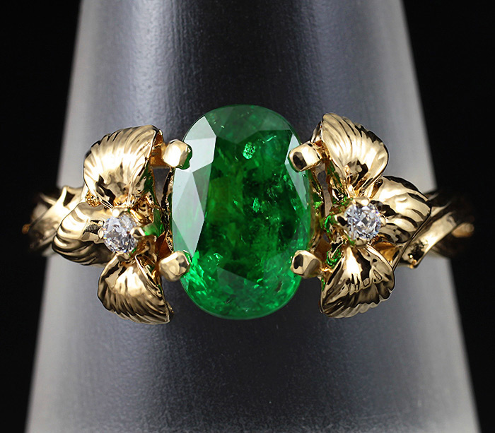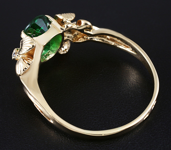 Вашему вниманию предлагается кольцо из золота 750 пробы c цаворитом гранатом и бриллиантами массой 0,05 карат! Диаметр бриллиантов 1,6 мм. Площадка 17 х 9 мм, высота 5 мм. Вес изделия 4,7 г. Размер 19,5. Ниже приводятся ювелирные характеристики цаворита граната.