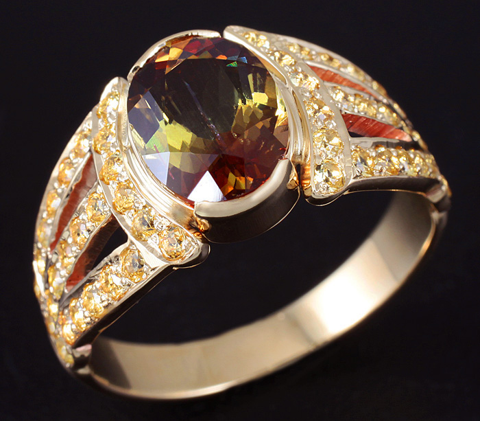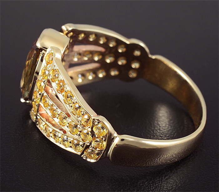 Вашему вниманию предлагается кольцо из золота 585 пробы c андалузитом и желтыми сапфирами! Диаметр сапфиров 2 мм. Площадка 21 х 11 мм, высота 5 мм. Вес изделия 3,9 г. Размер 17,5. Ниже приводятся ювелирные характеристики андалузита.