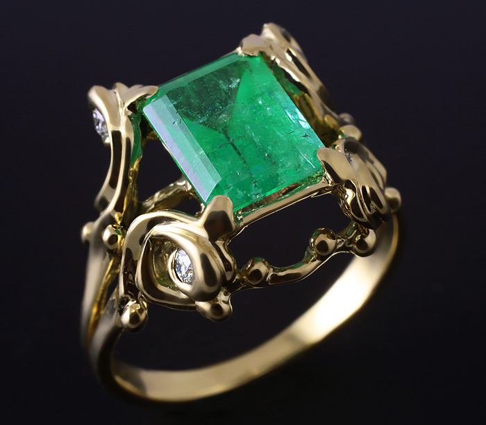 Вашему вниманию предлагается кольцо из золота 750 пробы с уральским изумрудом и 4 бриллиантами 0,14 карат! Диаметр бриллиантов 2 мм. Площадка 16 х 14 мм, высота 6 мм. Вес изделия 5,9 г. Размер 17. Ниже приводятся ювелирные характеристики изумруда.