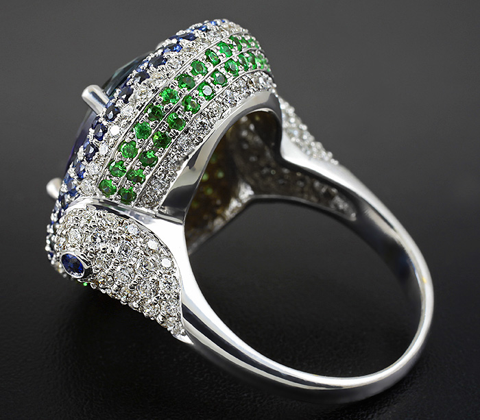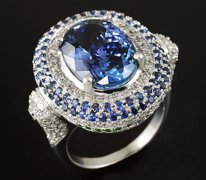 Кольцо c чистейшим полихромным танзанитом, синими сапфирами, цаворитами гранатами и бриллиантами