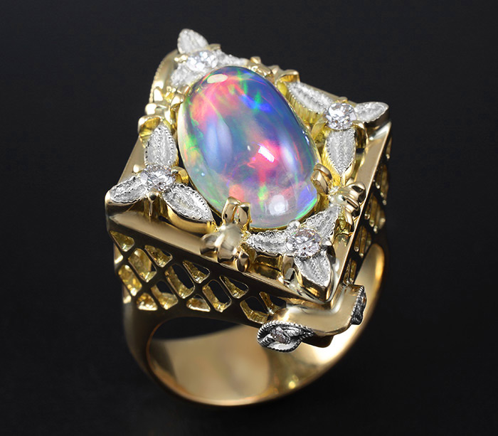 Вашему вниманию предлагается кольцо из золота 750 пробы c эфиопским опалом и 8 бриллиантами! Диаметр бриллиантов 1,3 мм и 2 мм. Площадка 27 х 21 мм, высота 12 мм. Вес изделия 11,8 г. Размер 18,5. Ниже приводятся ювелирные характеристики опала.