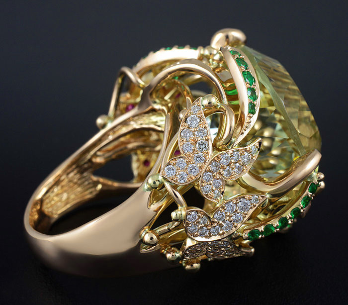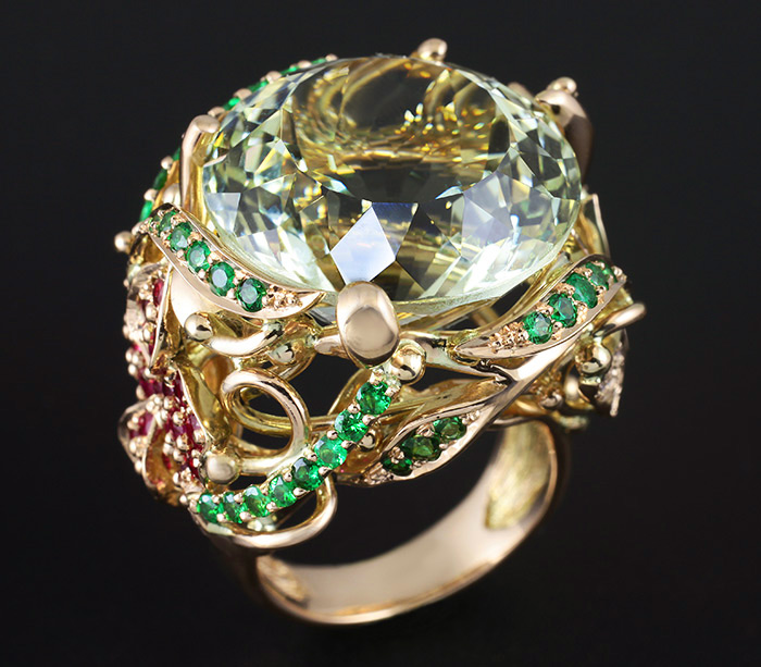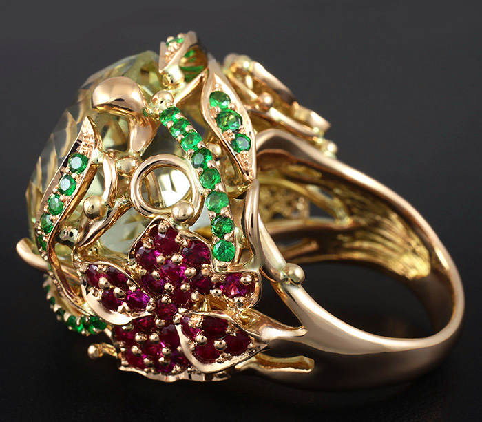 Кольцо с цитрином, цаворитами гранатами, рубинами и бриллиантами