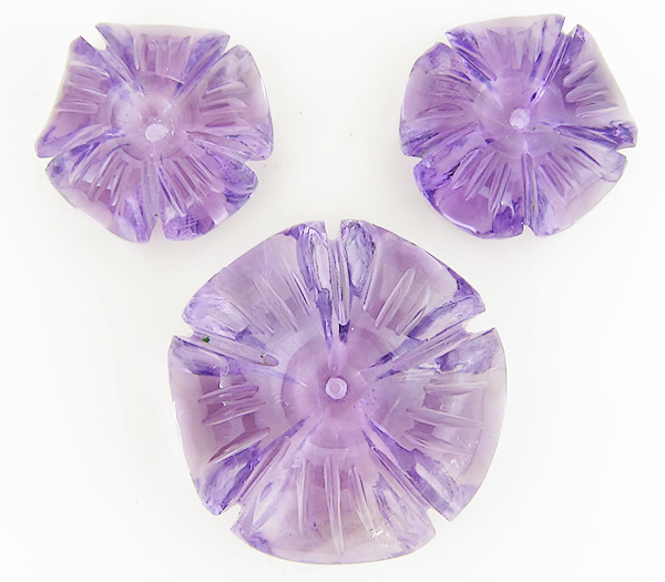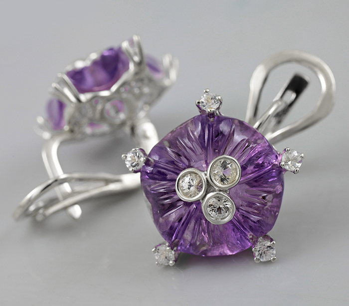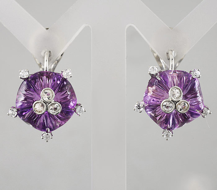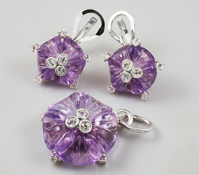 Вашему вниманию предлагается комплект (серьги + кулон) из стерлингового серебра (925 проба) с резными аметистами и бесцветными сапфирами! Диаметр сапфиров 2 мм. Вес комплекта 11,9 г.