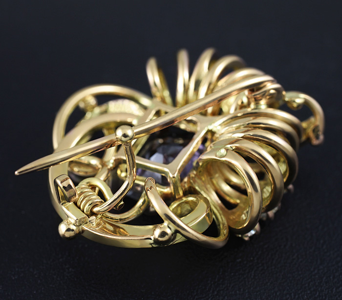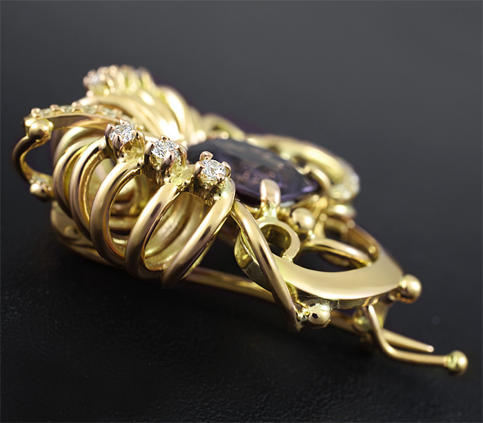 Вашему вниманию предлагается брошь/кулон из золота 585 пробы с розовато-пурпурной шпинелью и 22 бриллиантами! Диаметр бриллиантов от 1,15 мм до 1,7 мм. Площадка 32 х 24 мм. Вес изделия 8,5 г. Ниже приводятся ювелирные характеристики шпинели.