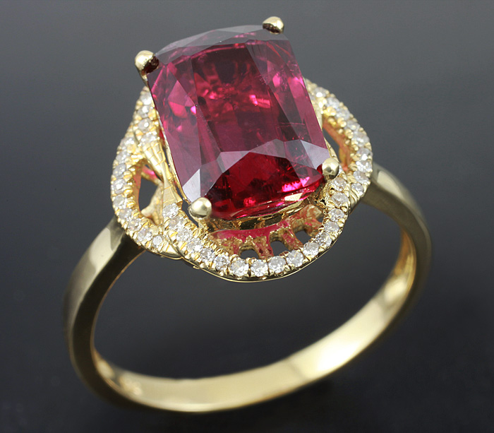 Вашему вниманию предлагается кольцо из золота 10 карат (417 проба) c рубеллитом турмалином и бриллиантами! Диаметр бриллиантов 0,9 мм. Площадка 14 х 12 мм, высота 7 мм. Вес изделия 2,5 г. Размер 17. Ниже приводятся ювелирные характеристики рубеллита.