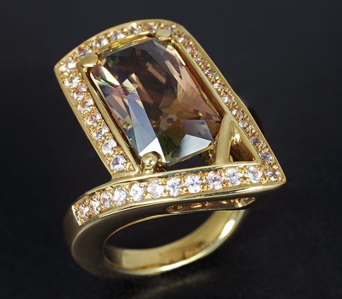 Вашему вниманию предлагается кольцо из золота 585 пробы с солнечным камнем и лейкосапфирами! Диаметр сапфиров 1,5 мм. Площадка 24 х 19 мм, высота 8 мм. Вес изделия 15,4 г. Размер 17. Ниже приводятся ювелирные характеристики солнечного камня.