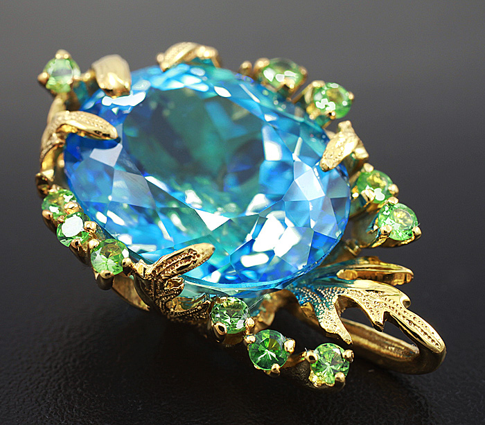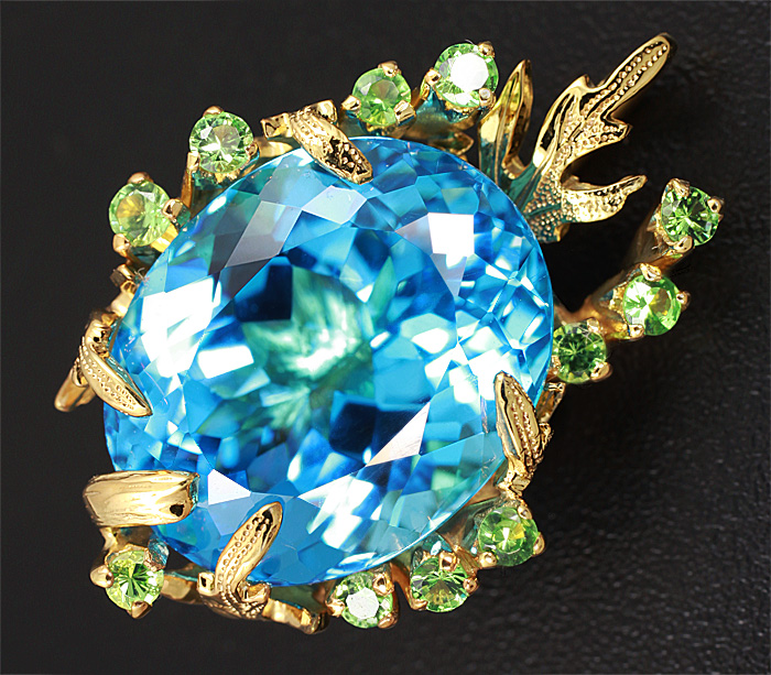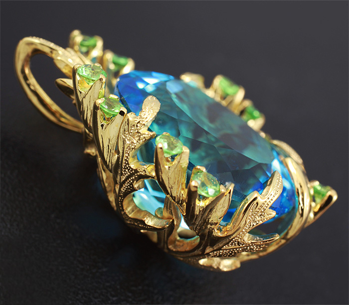 Диаметр цаворитов 2 мм. Площадка кулона 26 х 17 мм. Вес 7,6 г. Ниже приводятся ювелирные характеристики топаза.