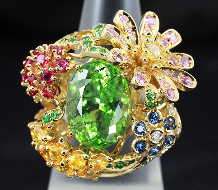 Кольцо, инкрустированное перидотом с рутилом и самоцветами