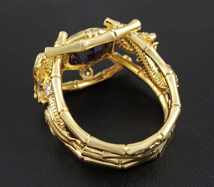 Вашему вниманию предлагается кольцо из золота 750 пробы, инкрустированое уникальным сапфиром со сменой цвета и бриллиантами! При смене освещения сапфир меняет оттенок с голубовато-пурпурного на пурпурный. Диаметр бриллиантов от 1 мм до 2 мм. Площадка 23 х 15 мм, высота 6 мм. Вес изделия 13,3 г. Размер 17,5. Ниже приводятся ювелирные характеристики сапфира.