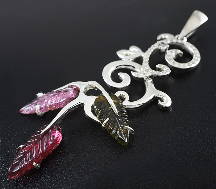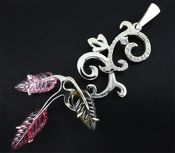 Вашему вниманию предлагается кулон из стерлингового серебра (925 проба) с резными турмалинами и бесцветными цирконами! Турмалины для этого кулона предлагались с готовыми вариантами дизайна украшения, разработанными специально для них. Размеры вставок от 1 мм до 2 мм. Размеры кулона с петлей 61 х 27 мм. Вес 4,5 г. Ниже приводятся ювелирные характеристики вставок.