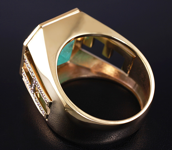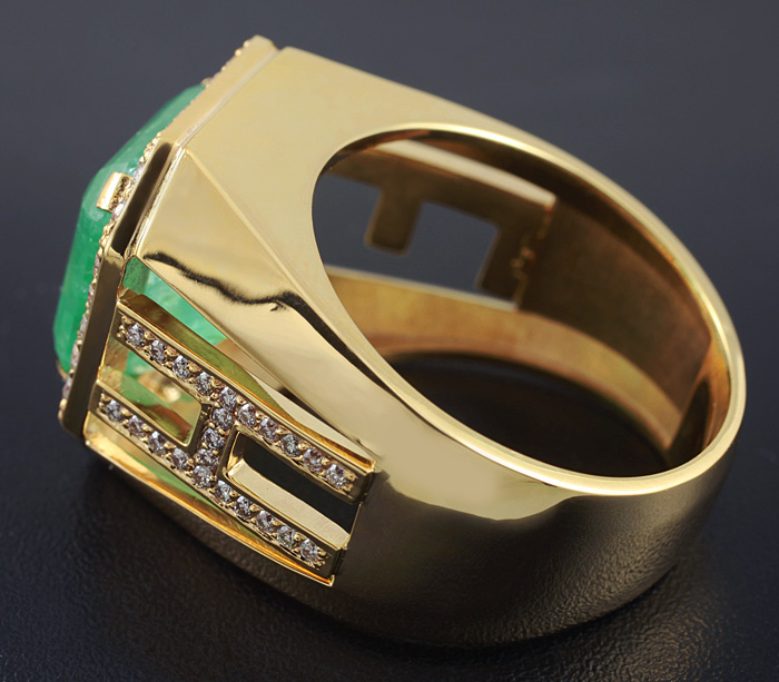Вашему вниманию предлагается перстень из золота 585 пробы с изумрудом 9,5 карат и 70 бриллиантами! Кольцо отливалось по уникальной 3D модели, а шинку кольца украшают инициалы заказчика. Размеры изумруда 13 х 13 мм, диаметр бриллиантов 1 мм и 1,5 мм. Площадка 25 х 18 мм, высота 10 мм. Вес изделия 16,1 г. Размер 20.