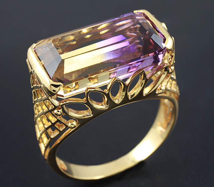 Вашему вниманию предлагается кольцо из золота 585 пробы с аметрином! Площадка 22 х 12 мм, высота 10 мм. Вес изделия 8 г. Размер 20. Ниже приводятся ювелирные характеристики аметрина.