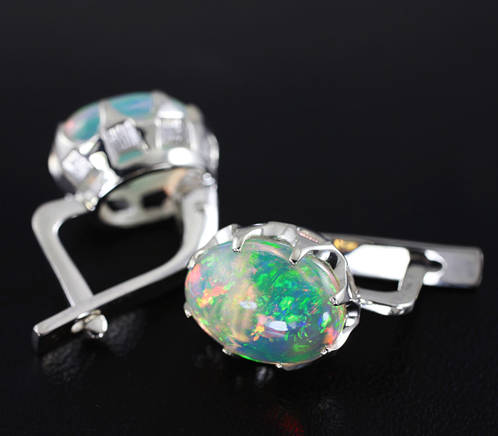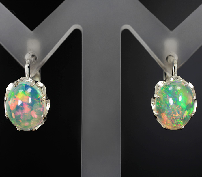 Вашему вниманию предлагаются серьги из стерлингового серебра (925 проба) с эфиопскими кристаллическими опалами! Основные цвета опалесценции опалов: красный/желтый/зеленый. Площадка серег 13 х 9 мм. Вес пары 3,2 г. Ниже приводятся ювелирные характеристики опалов.