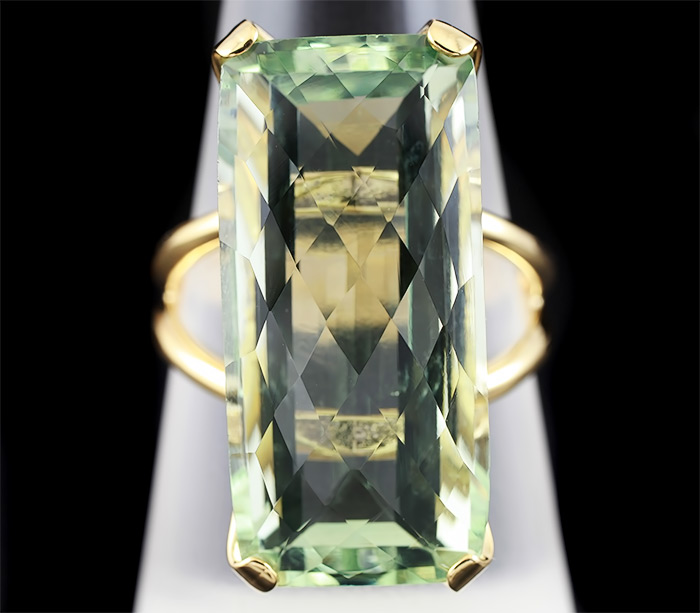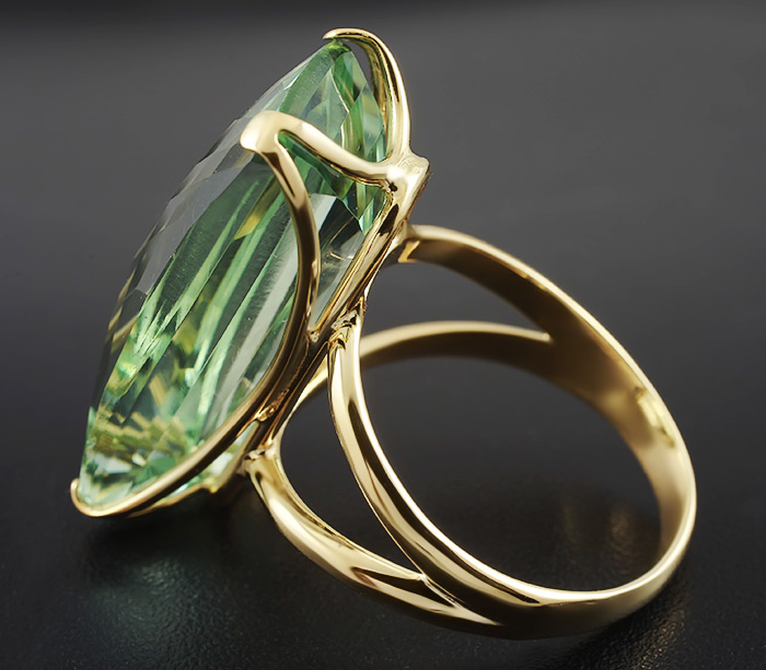 Вашему вниманию предлагается кольцо из золота 585 пробы с зеленым аметистом! Площадка 26 х 12 мм, высота 10 мм. Вес изделия 8,6 г. Размер 18. Ниже приводятся ювелирные характеристики.