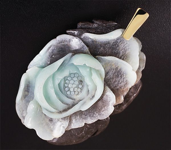 Вашему вниманию предлагается кулон из золота 585 пробы с миниатюрой «Пион» из цельного куска амазонита! Размеры миниатюры 47 х 34 х 15 мм. Размеры кулона с петлей 54 х 34 мм. Вес 26,4 г.