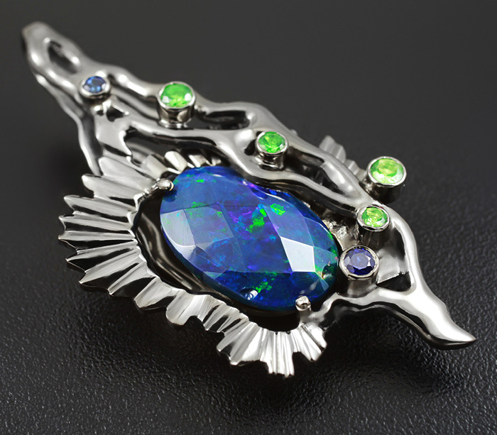 Кулон с ограненным черным опалом, цаворитами гранатами и синими сапфирами