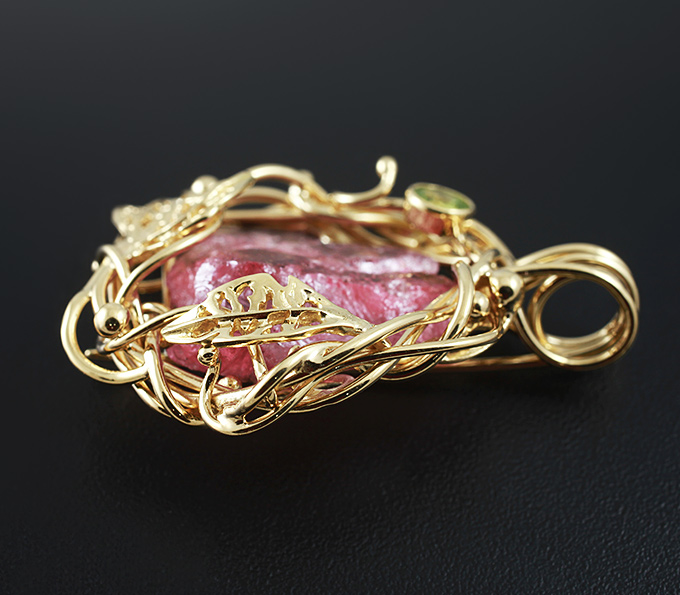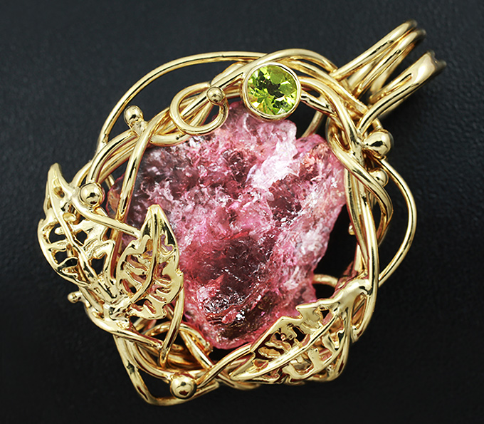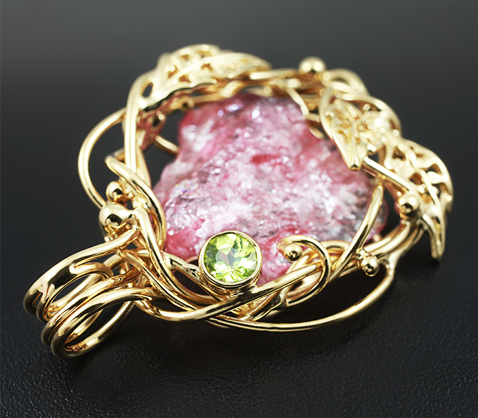 Брошь/кулон с необработанным розовым турмалином и перидотом