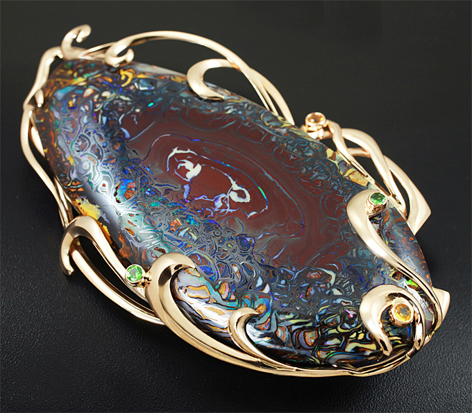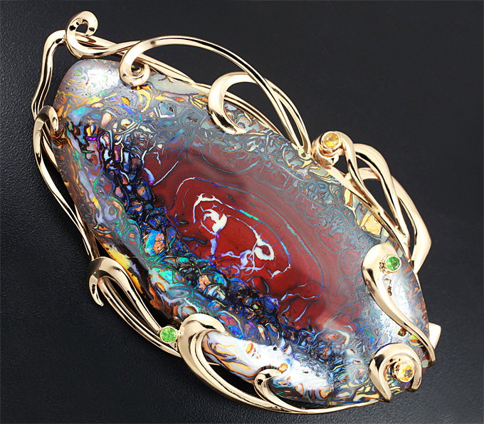 Брошь/кулон с австралийским болдер опалом, сапфирами и цаворитами гранатами