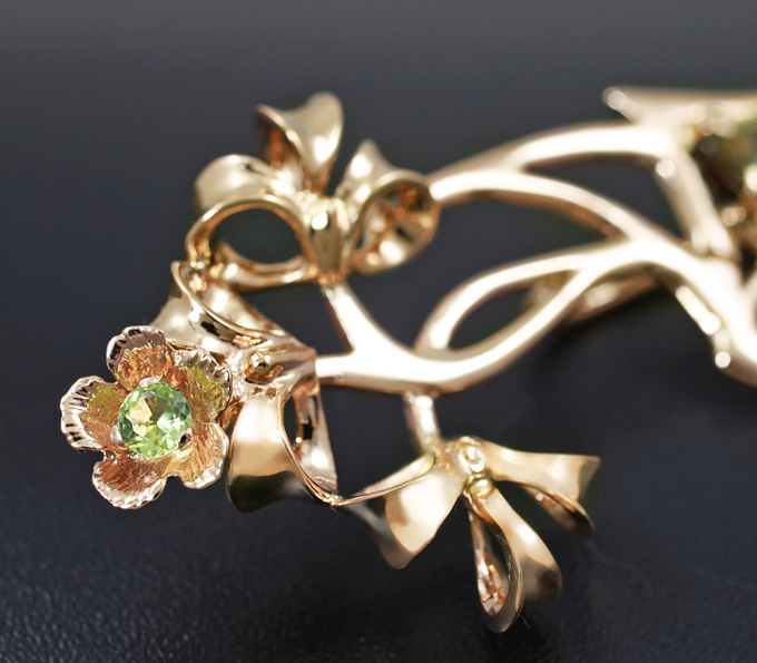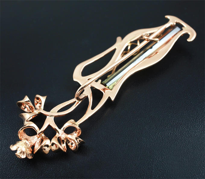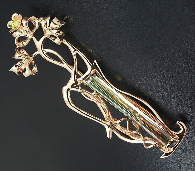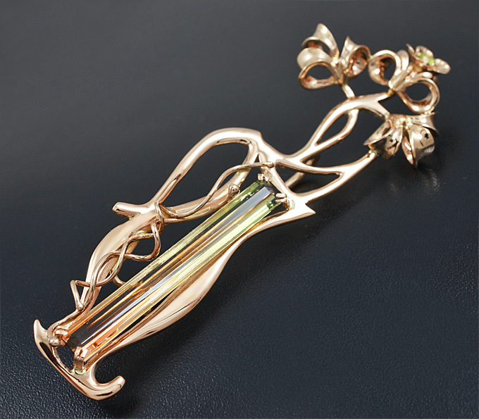 Вашему вниманию предлагается брошь/кулон из золота 585 пробы с полихромным турмалином и перидотом! Турмалин сочетает оранжевый, желтый и зеленый цвета. Диаметр перидота 2,5 мм. Площадка изделия 73 х 25 мм. Вес 9,8 г. Ниже приводятся ювелирные характеристики.
