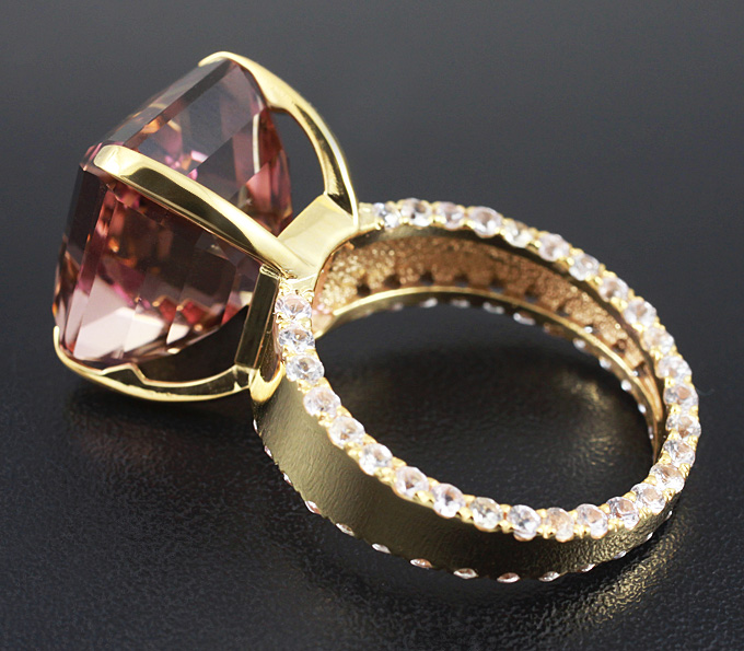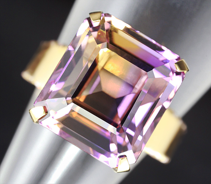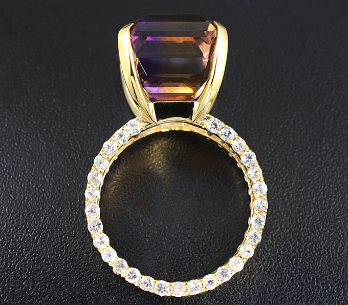 Вашему вниманию предлагается кольцо из золота 585 пробы с аметрином и лейкосапфирами! Диаметр сапфиров 1,5 мм. Площадка 13 х 12 мм, высота 12 мм. Вес изделия 5,5 г. Размер 16,5. Ниже приводятся ювелирные характеристики аметрина.
