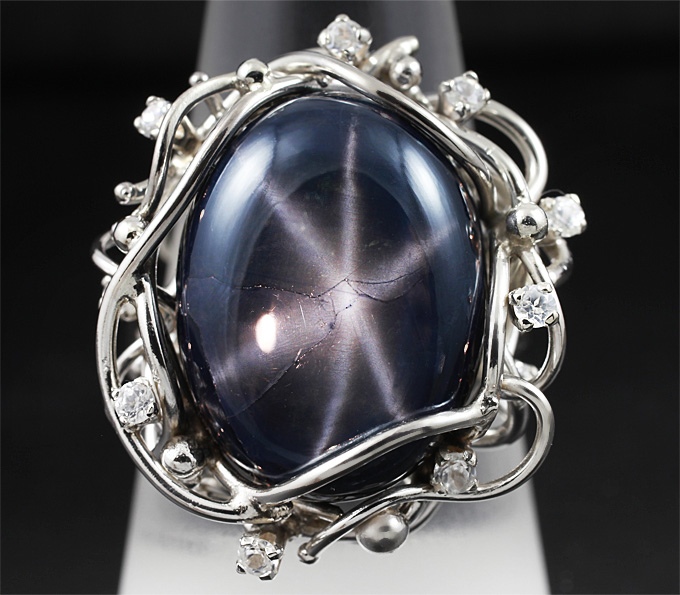 Кольцо cо звездчатым сапфиром и лейкосапфирами